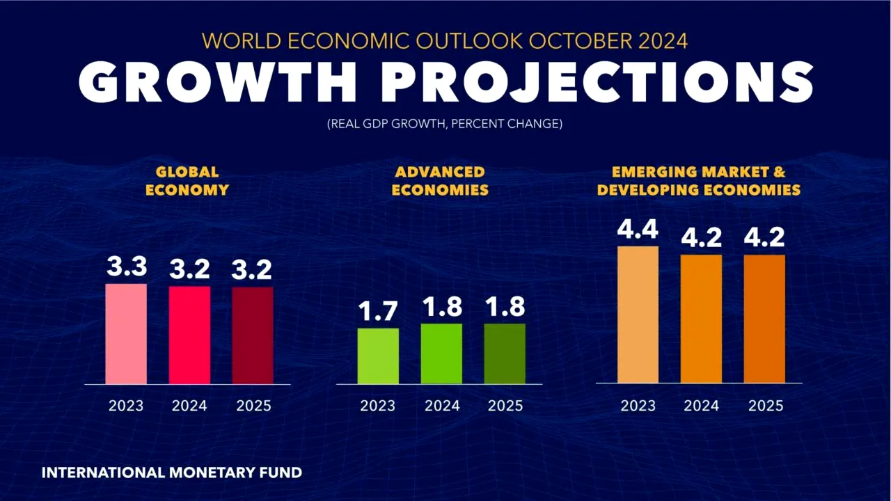 La nivel mondial, creșterea economică ar urma să fie de 3,2% atât anul acesta, cât și anul viitor, în scădere de la 3,3% în 2023. Statele Unite ar urma să aibă o creștere economică de 2,8% în 2024 și de 2,2% anul viitor, în timp ce în zona euro creșterea economică va fi de 0,8% anul acesta și de 1,2 în 2025.