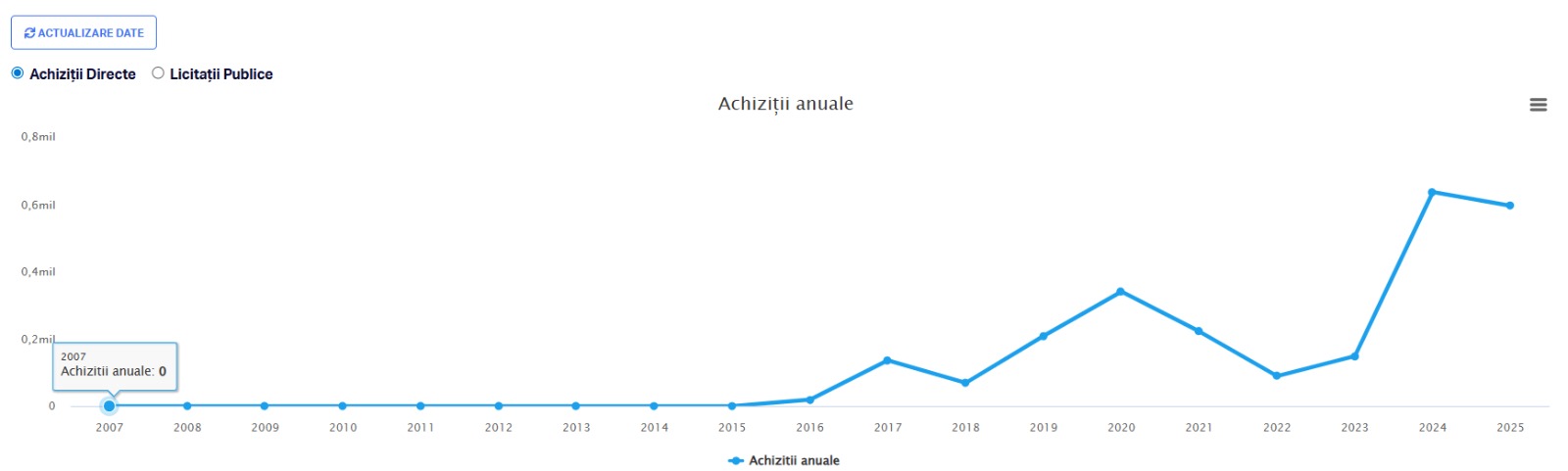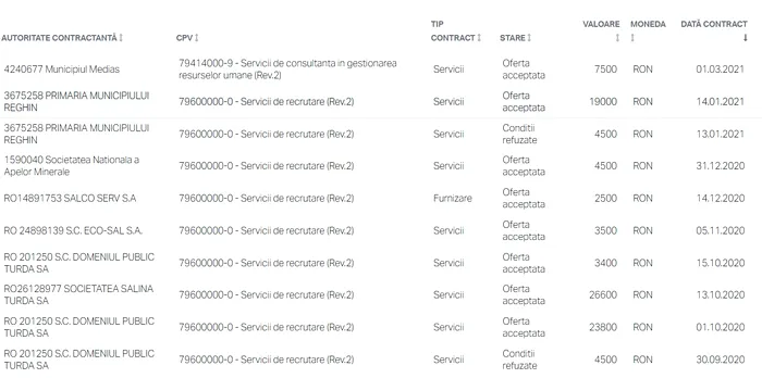 Datele Termene.ro arată că firma de recrutare are zeci de contracte de achiziții directe cu mai multe entități ale statului, de la companii precum Hidroelectrica, CE Oltenia, Primăria Reghin sau Mediaș. Deși firma are o vechime de 23 de ani, achizițiile publice au explodat începând cu 2016.