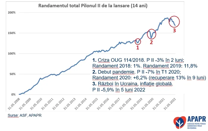Performanţa Pilonului II a depăşit substanţial inflaţia cumulată în perioada 2008-2021, dar în prima pate a anului, pieţele financiare în special şi economiile statelor în general traversează un episod negativ, pe de-o parte din cauza războiului din Ucraina, pe de altă parte din cauza inflaţiei record care afectează toate statele lumii, criză plecată de la preţurile energiei şi altor materii prime, conform unei analize a Asociația pentru Pensiile Administrate Privat din România (APAPR).