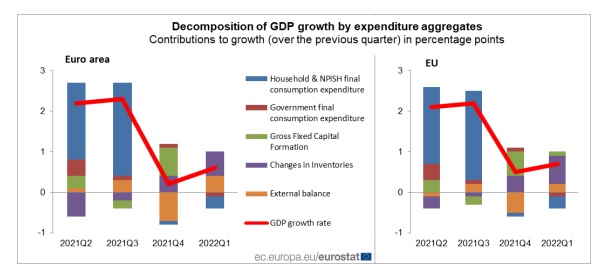 Potrivit Eurostat, PIB-ul în UE a crescut, în medie, cu 0,7%, iar în zona euro, cu 0,6%, în serie ajustată sezonier, în trimestrul I din 2022, față de trimestrul IV din 2021. În intervalul precedent, creșterea fusese de 0,5% în UE și 0,2% în zona euro.