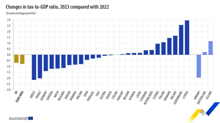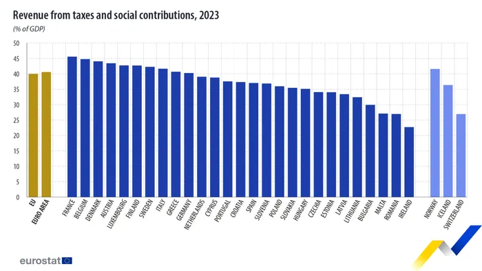 Rata totală a taxelor în raport cu PIB-ul, adică suma taxelor și contribuțiilor sociale nete ca procent din produsul intern brut (PIB), a fost de 40,0% în UE în 2023, o scădere față de 2022 (40,7%). În zona euro, rata taxelor în raport cu PIB-ul a scăzut, de asemenea, de la 41,4% în 2022 la 40,6% în 2023.