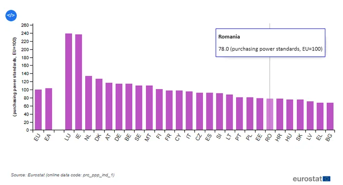 Rezultatele preliminare pentru 2025, publicate de Eurostat, arată că România este la 78% din PIB per capita la paritatea puterii de cumpărare față de media Uniunii Europene. Datele europene mai arată că Ungaria este sub noi la nivelul de trai, în timp ce Grecia și Bulgaria sunt codașele Uniunii Europene.