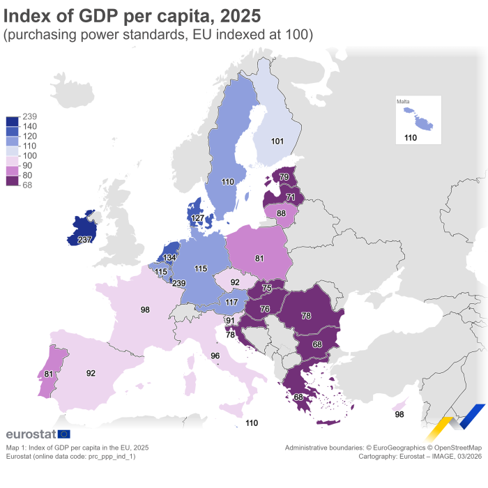 Acesta a variat între 68% din media UE în Grecia și Bulgaria și 239% în Luxemburg. În 2025, media UE s-a situat la aproximativ 41.600 de euro în termeni de putere de cumpărare, un punct de referință comun în funcție de care sunt evaluate toate statele membre.