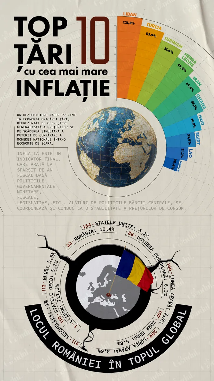 Mai concret, România se află pe locul 33 global, cu 10,4%, în timp ce în Liban, indicele care reflectă creșterea prețurilor era de 221,3%. Pe ultimul loc, cu o inflația abia perceptibilă, de 0,1%, este Bahrain, iar Seychelles închide șirul datelor disponibile, cu o deflație de -1%.