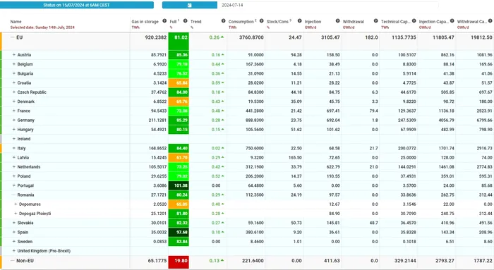 În această lună s-a înregistrat maximul istoric al depozitării gazelor pentru iulie, conform graficelor istorice ale GIE, care au pornit la 2 ianuarie 2012. La acel moment, avea în depozite 16,96 TWh și o capacitate totală de stocare de 31,41TWh.