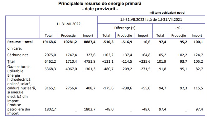 Producţia internă a însumat 10.281,2 mii tep, în scădere cu 516,9 mii tep faţă de aceeași perioadă din 2021, iar importul a fost de 8.887,4 mii tep, cu 0,1% mai mult decât anul trecut.