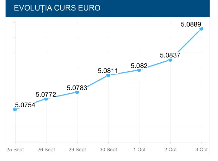 Cursul euro- leu a urcat la 5,088 vineri, 3 octombrie, aproape de un nou maxim istoric. Practic, moneda națională a slăbit în fața monedei euro, ceea ce face ca prețurile din România pentru apartamente, mașini sau pentru achiziții online de peste granițe, să crească direct proporțional.
