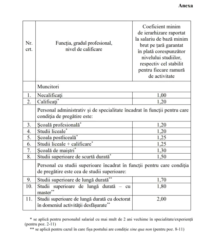 „Cuantumul salariului brut lunar se stabileşte prin aplicarea unui coeficient raportat la salariul de bază minim brut pe ţară garantat în plată, stabilit prin hotărâre a Guvernului, potrivit legii. Prezenta lege stabilește coeficienții minimali de ierarhizare salarială pentru sectoare de activitate pentru care nu au fost încheiate contracte colective de muncă aplicabile la nivelul întregului sector de activitate și pentru care nu există legi speciale privind salarizarea sau contract colectiv de muncă la nivel de unitate în vigoare, cu respectarea prevederilor .Coeficienţii minimali de ierarhizare sunt aplicabili pentru toate categoriile de salariaţi încadraţi pe funcţii pentru care este obligatoriu un nivel de calificare potrivit anexei la prezenta lege”, se arată în textul legii.