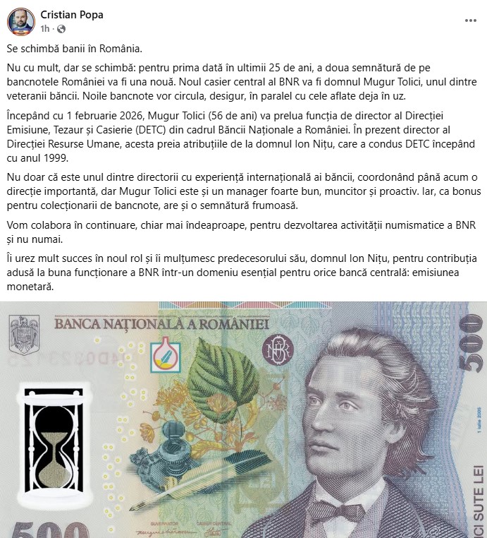 Cristian Popa, membru în Consiliul de Administraţie al Băncii Naţionale a României, a anunțat pe pagina sa de Facebook, că, înceând de la 1 februarie 2026, Mugur Tolici va prelua funcția de director al Direcției Emisiune, Tezaur și Casierie (DETC) din cadrul Băncii Naționale a României.