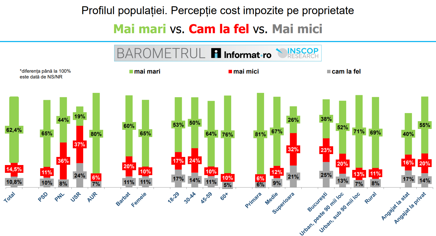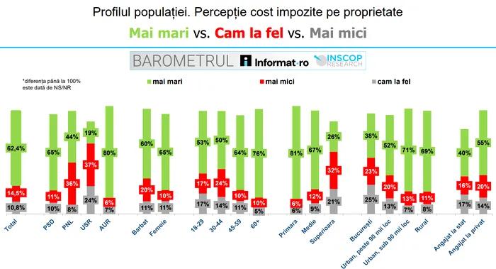 Printre cei care sunt de părere că impozitele sunt mai mici decât în Uniunea Europeană se numără votanții PNL și USR, bărbații, persoanele între 30 și 44 de ani, cei cu educație superioară, locuitorii din București și din urbanul mare, angajații din sectorul privat.