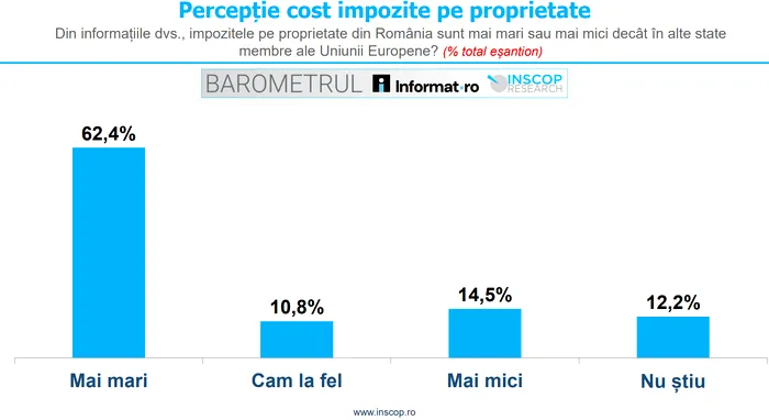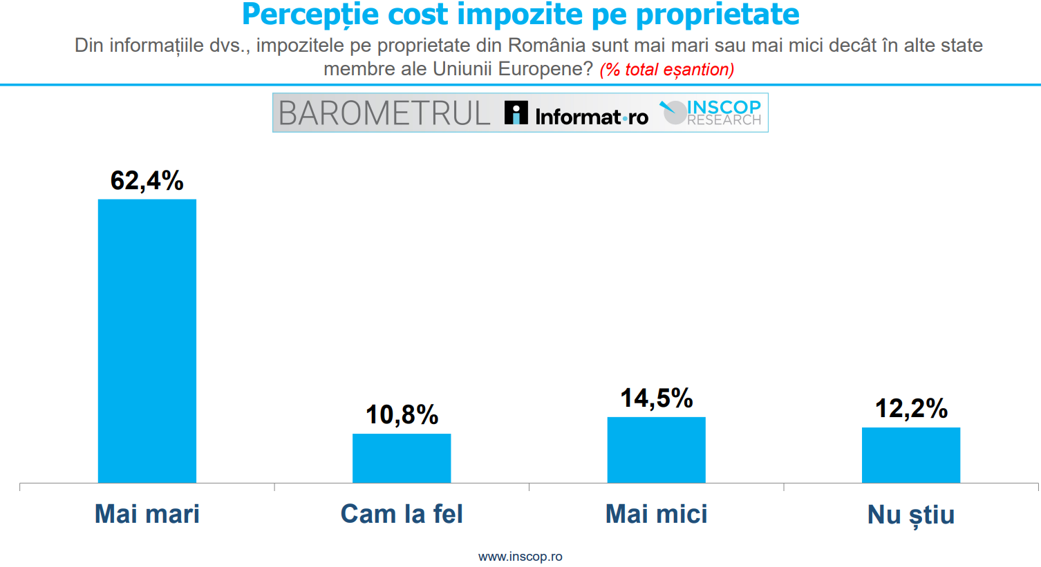 Potrivit sondajului, majoritatea românilor, în proporție de 62,4% consideră că impozitele pe proprietate din România sunt mai mari decât în celalte țări din U.E. De asemenea, 14.5% cred că impozitele sunt mai mici, în timp ce 10.8% sunt de părere că sunt cam la fel. 12.2% nu știu.
