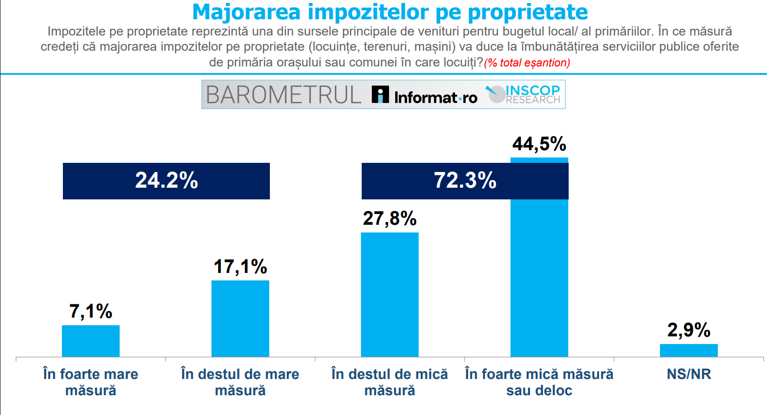 Întrebați în ce măsură cred că majorarea impozitelor pe proprietate va duce la îmbunătățirea serviciilor publice oferite de primăria orașului sau comunei în care locuiesc, 7.1% dintre respondenți spun că în foarte mare măsură, 17.1% în destul de mare măsură, 27.8% în destul de mică măsură, iar 44.5% în foarte mică măsură sau deloc. Ponderea non-răspunsurilor este de 2.9%.