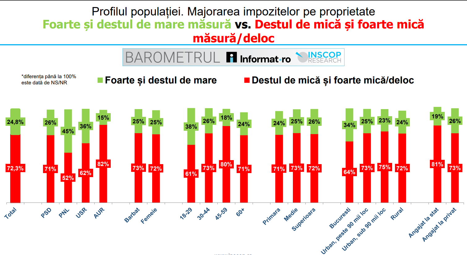 Votanții AUR, persoanele între 45 și 59 de ani și angajații la stat cred cel mai puțin că majorarea impozitelor pe proprietate va duce la îmbunătățirea serviciilor publice oferite de primăria orașului sau comunei.