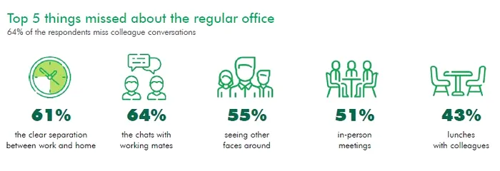 Chiar dacă procentul de angajați care lucrează de acasă va crește, faptul că oamenii sunt ființe sociale îi determină să aibă nevoie de interacțiune fizică, precum și de un echilibru între viața profesională și cea personală, după cum arată rezultatele cercetării.