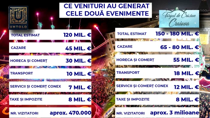 Când vine vorba de impactul economic, Untold rămâne lider detașat pentru că reușește să aducă încasări uriașe în doar câteva zile de eveniment. Dacă e vorba strict despre încasările comercianților, durata evenimentului, numărul total de turiști și bani distribuiți pe termen lung în economia locală, Târgul de Crăciun de la Craiova devine câștigător. Cu aproape 2 luni de eveniment, milioane de vizitatori și un consum constant, Craiova a reușit să transforme un simplu târg de Crăciun într-un adevărat motor economic și a reușit o performanță remarcabilă pentru România. Totuși, Untold rămâne constant an de an atunci când vine vorba de atragerea unui număr mare de turiști și nu are nevoie de confirmări din partea unor competiții, așa cum a fost în cazul Târgului de la Craiova.