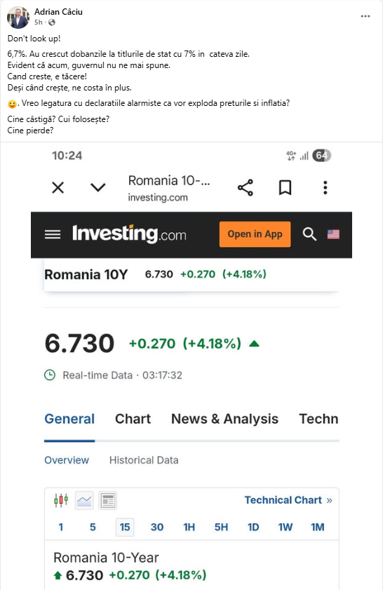 „Don’t look up! 6,7%. Au crescut dobânzile la titlurile de stat cu 7% în câteva zile. Evident că acum, guvernul nu ne mai spune. Când crește, e tăcere! Deși când crește, ne costă în plus”, a scris Adrian Câciu pe Facebook.