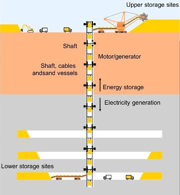 Pentru această metodă de generare de energie, cel mai important element este puțul minei. Containere pline de nisip (sau alt material greu) sunt coborâte în puț în momentele în care cererea de energie din rețea este foarte ridicată. În timp ce greutatea coboară, o serie de generatoare/motoare electrice din puț produc energie prin frânare regenerativă, o metodă împrumutată din industria auto.