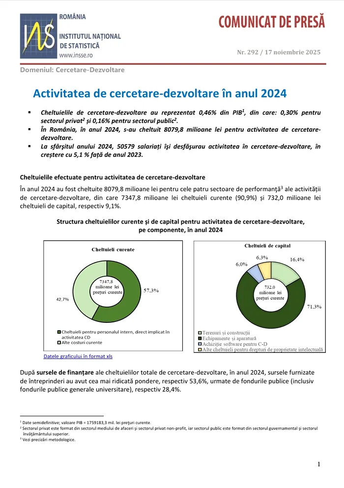 „Cheltuielile de cercetare-dezvoltare au reprezentat 0,46% din PIB, din care: 0,30% pentru sectorul privat şi 0,16% pentru sectorul public. În România, în anul 2024, s-au cheltuit 8,079 miliarde lei pentru activitatea de cercetare-dezvoltare”, arată datele INS.