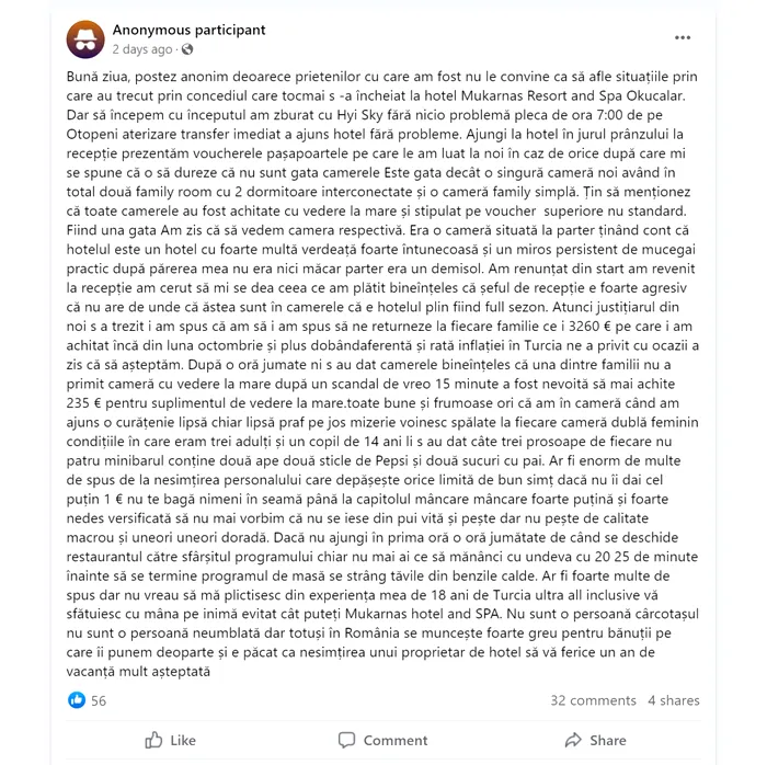 Între timp, o româncă a avut parte de o vacanță de coșmar în Turcia pe care nu o va uita prea curând. Ea plătise 3.260 euro cazarea la all inclusive, în cadrul unui hotel de 5 stele din Turcia, pentru două familii.