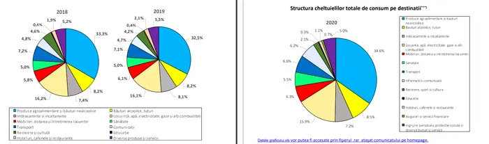 Conform clasificării standard pe destinaţii a cheltuielilor de consum (COICOP), în anul 2020, produsele alimentare şi băuturile nealcoolice au deţinut din consumul gospodăriilor, în medie, 34,6%. O pondere semnificativă deține plata serviciilor – 15,9%.
