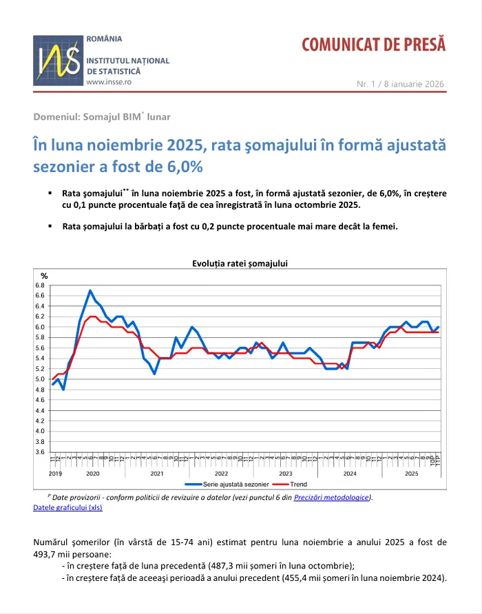 „Rata şomajului în luna noiembrie 2025 a fost, în formă ajustată sezonier, de 6%, ȋn creştere cu 0,1 puncte procentuale faţă de cea ȋnregistrată ȋn luna octombrie 2025. Rata şomajului la bărbaţi a fost cu 0,2 puncte procentuale mai mare decât la femei”, arată datele INS.