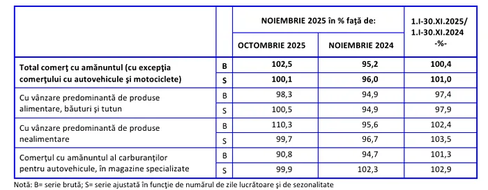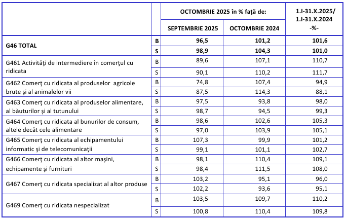 Singura creștere înregistrată a fost în cazul cifrei de afaceri din comerțul cu ridicata. Potrivit datelor INS, aceasta a crescut în octombrie 2025, față de aceeași lună din 2024, dar numai cu 1,2%. Totuși, sectorul a înregistrat scăderi la comerțul cu ridicata al produselor agricole brute și al animalelor vii, comerțul cu ridicata specializat al altor produse și comerțul cu ridicata al produselor alimentare, al băuturilor și al tutunului.