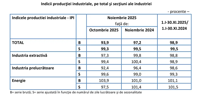 În luna noiembrie 2025, producția industrială a scăzut față de luna precedentă cu 6,1% din cauza industriei prelucrătoare și industriei extractive. Spre deosebire de luna corespunzătoare din 2024, producția industrială (serie brută) a scăzut cu 2,8%, ca efect al scăderilor înregistrate de industra prelucrătoare și industria extractivă. De asemenea, producția și furnizarea de energie electrică și termică, gaze, apă caldă și aer condiționat a crescut cu 1%. Industria prelucrătoare a scăzut cu 1%, iar producția și furnizarea de energie electrică și termică, gaze, apă caldă și aer condiționat și industria extractivă a crescut cu 1,4%, respectiv cu 0,4%.