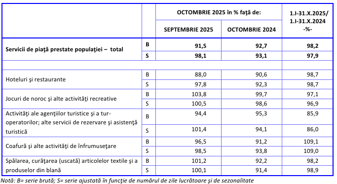 Mai departe, volumul cifrei de afeceri din servicii a scăzut în octombrie 2025 față de octombrie 2024, atât ca serie brută, cu 7,3%, cât și ca serie ajustată cu 6,9%, ca urmare a scăderilor din hoteluri și restaurante, servicii de coafură și înfrumusețare, spălare și curățare textile, agenții de turism și jocuri de noroc, conform datelor INS. Practic, volumul cifrei de afaceri din servicii se referă la cât „se vând” serviciile într-o anumită perioadă de timp. Indicatorul economic arată ce venituri au obținut firmele din diverse domenii fără să fie inclus TVA-ul sau alte venituri care nu țin direct de prestarea serviciilor.