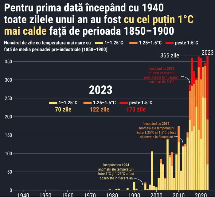 Iar față de perioada preindustrială (1850–1900), 2023 a fost primul an în care anomalia temperaturii pentru fiecare zi a fost de cel puțin 1°C (Figura 4).