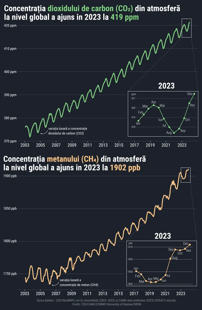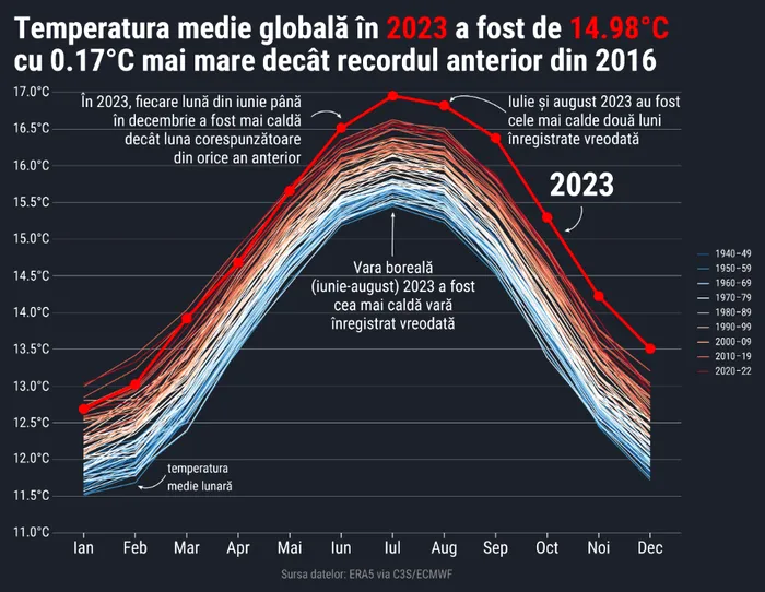 Potrivit datelor Copernicus, temperatura medie globală în 2023 a fost de 14,98°C, cu 1,48°C mai mare decât media din perioada preindustrială 1850–1900 (Figura 1). Față de recordul anterior stabilit în 2016, 2023 a fost cu 0,17°C mai cald. Începând din iunie, fiecare lună din 2023 a depășit temperaturile lunilor corespunzătoare din toți anii precedenți (1940–2022), iar lunile iulie și august au înregistrat cele mai ridicate temperaturi din toate timpurile, notează Bogdan Antonescu pentru Infoclima.
