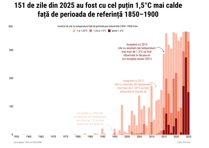 • În 2025, peste 150 de zile au depășit pragul de 1,5°C. Aceasta înseamnă că aproape jumătate din an a fost peste ținta stabilită de Acordul de la Paris.
