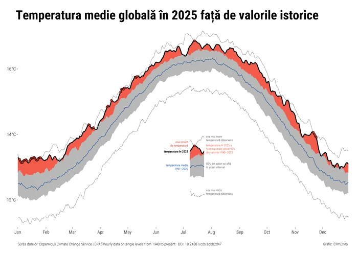 Acest grafic ne permite să vedem cum a evoluat temperatura medie globală în 2025. Linia roșie reprezintă temperatura din 2025, în timp ce zona gri arată întreaga gamă de temperaturi observate în ultimii 85 de ani (1940-2025).