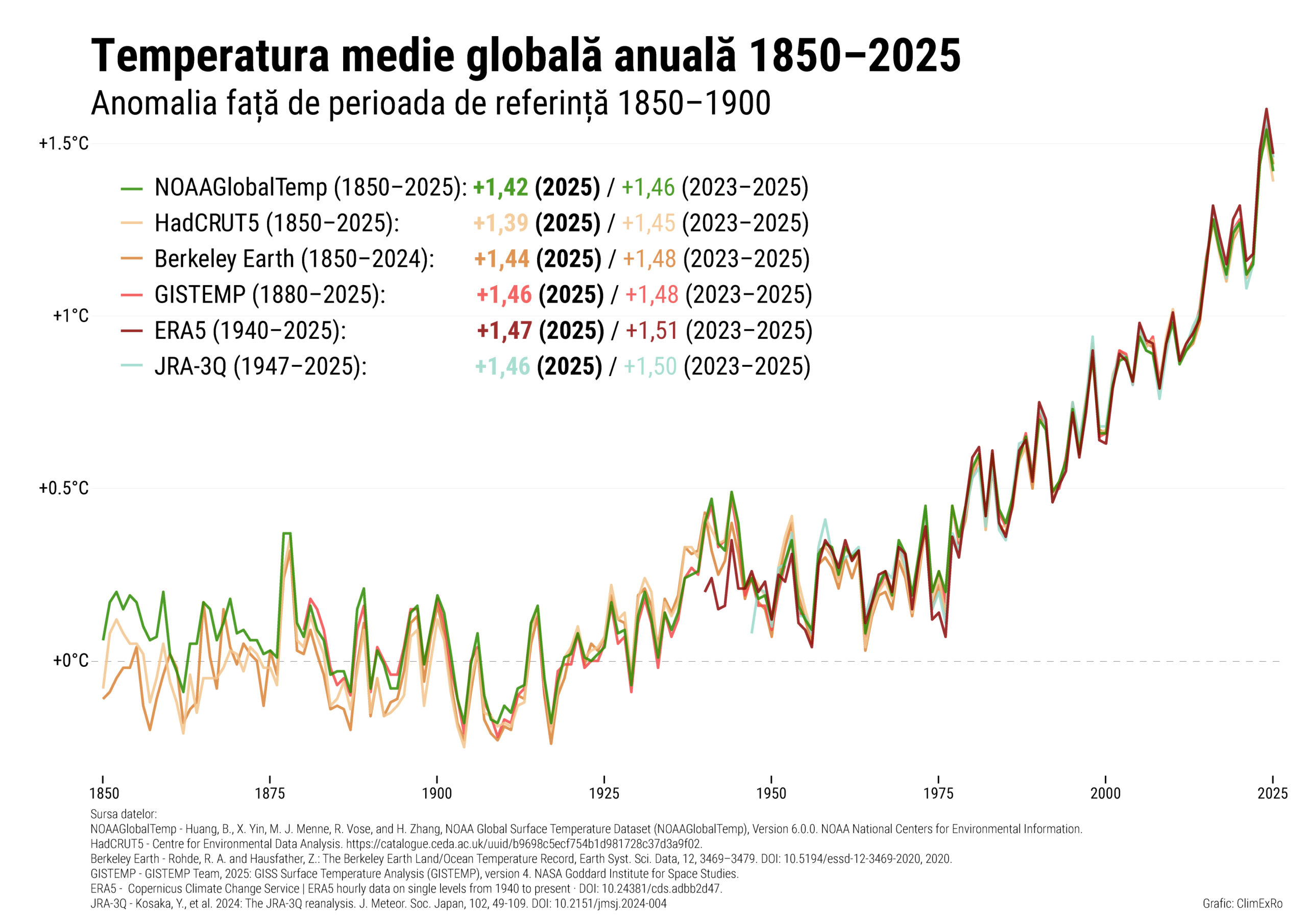 Acordul de la Paris din 2015 stabilise ca țintă limitarea încălzirii la 1,5°C. Am atins deja acest prag. Fiecare fracțiune de grad în plus înseamnă mai multe valuri de căldură, mai multe perioade cu secetă, mai multe inundații și un impact mai mare asupra ecosisteme și pentru societății. Graficul ne arată mai multe surse de date și toate spun același lucru: 2025 a fost unul dintre cei mai calzi ani înregistrați vreodată, parte a unui trend crescător.