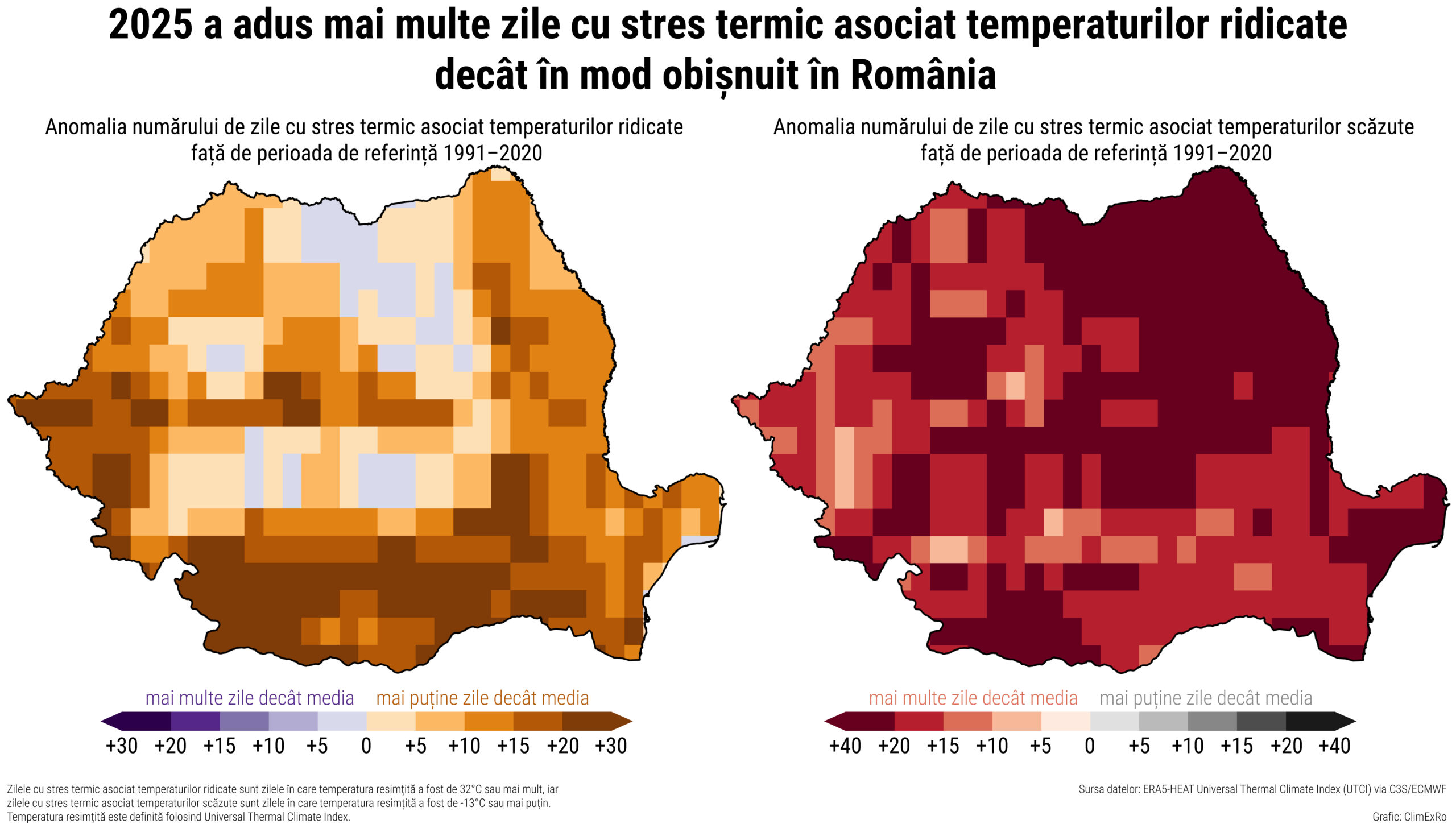 În 2025, România a avut mult mai multe zile cu stres termic asociat căldurii extreme decât în mod obișnuit, în unele zone cu peste 20-30 de zile în plus față de media 1991-2020.
