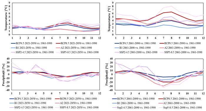 Figura 1. Schimbările medii lunare multianuale în orizonturile de timp 2021-2050 vs. 1961-1990 (stânga) și 2061-2090 vs. 1961-1990 (dreapta) ale temperaturii aerului (în °C, sus) și precipitații (în %, jos), mediate pe tot teritoriul României, în condițiile mai multor scenarii climatice (ilustrate cu linii colorate).