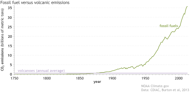 Spre exemplu, erupția vulcanului St. Helens (1980) și Pinatubo (1991) au emis cantități de dioxid de carbon echivalente cu emisiile antropice timp de 9 ore. În prezent, această cantitate de CO2 este eliberată în doar 2.5 ore. Însă chiar și aceste erupții vulcanice sunt prea rare pentru a putea rivaliza cu emisiile antropice ce continuă oră de oră, an de an.