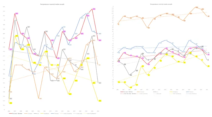 Ca exemplu, pentru București, anii 2007–2019–2020 au reprezentat vârfuri ale temperaturilor medii maxime anuale cu peste 19°C, care au influențat, desigur, temperaturile medii anuale, dar care au fost contrabalansate de temperaturile medii minime anuale de sub 5°C, înregistrate între 2006–2011. Acest lucru a dus la un trend crescător al temperaturii medii anuale, pentru perioada 2006–2021: 0,6°C.