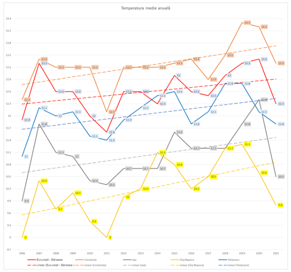 În alte cuvinte, între 2006–2021 temperatura medie în Cluj-Napoca a crescut cu 1,4 °C, în Iași și Constanța cu 0,9 °C, în timp ce pentru București cu 0,6°C la stația meteorologică Băneasa, iar pentru Timișoara cu 0,7 °C.
