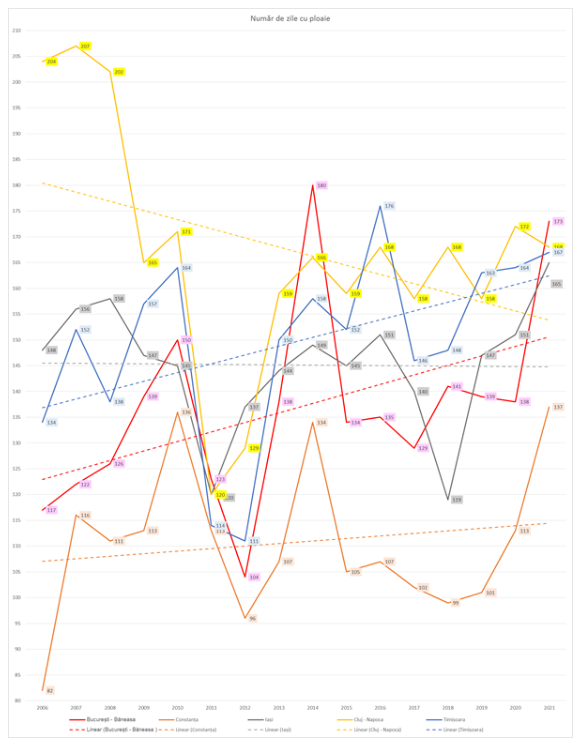 Trendul de creștere al temperaturilor din partea sudică a României este dat și de creșterea numărului de zile cu precipitații anuale. Poate părea un paradox pentru fenomenele de secetă extremă înregistrate în luna iulie 2022 pe teritoriul României.