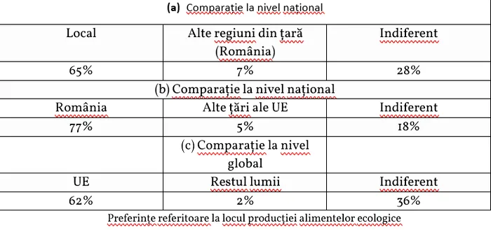Rezultatele unei cercetări realizate pe un eșantion de 424 de consumatori români au arătat 65% dintre respondenți preferă alimentele produse local față de cele din alte surse naționale. De asemenea, 77% din eșantion preferă alimentele din România față de cele din alte țări ale UE și 62% preferă produsele europene față de cele din restul lumii.