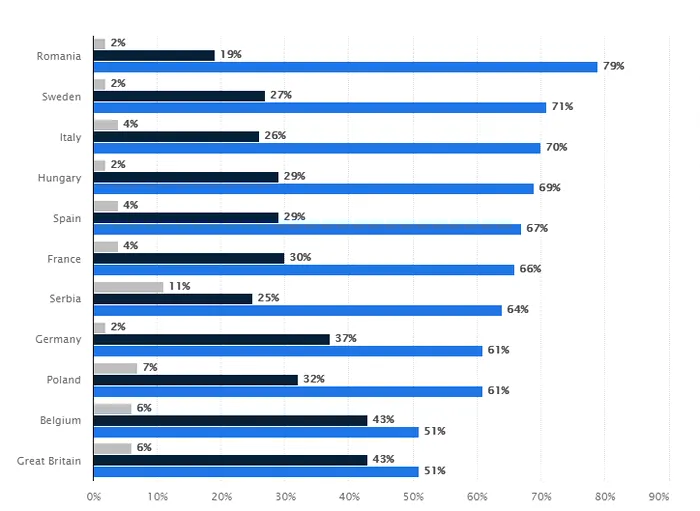 Ponderea respondenților care preferă să mănânce alimente produse local în anumite țări europene, în septembrie 2018 (albastru – acord; negru – dezacord; gri – nu știu)