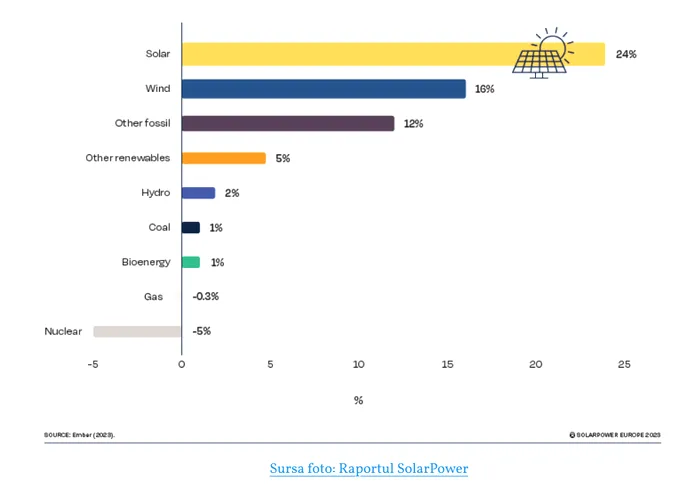 Mulți experți din domeniul energiei solare sunt încrezători că, după un an 2022 excepțional, este posibilă o creștere semnificativă și în 2023. Se pune mai degrabă întrebarea cât de semnificativă va fi această creștere, având în vedere graficul de mai jos, care evidențiază poziția dominantă a energiei solare în anul 2022.