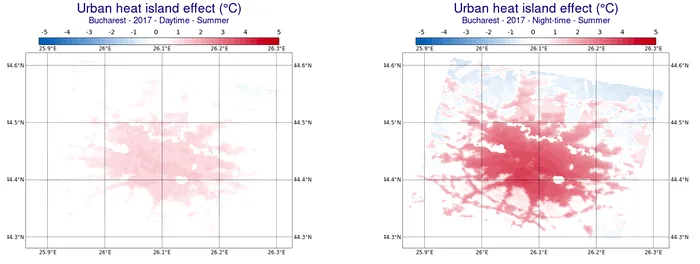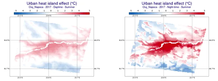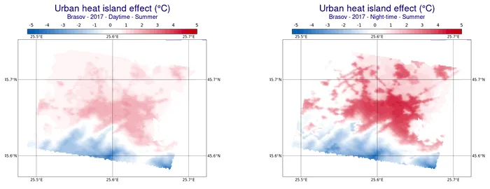 Datele pentru insulele de căldură urbană din 2017 indică o diferență de temperatură între zonele urbane și cele rurale din Brașov, București și Cluj Napoca. Aceasta diferența a fost mult mai mare pe timp de noapte, când temperatura medie în cele 3 orașe a fost cu până la 5 °C mai mare decât în localitățile rurale din apropiere.