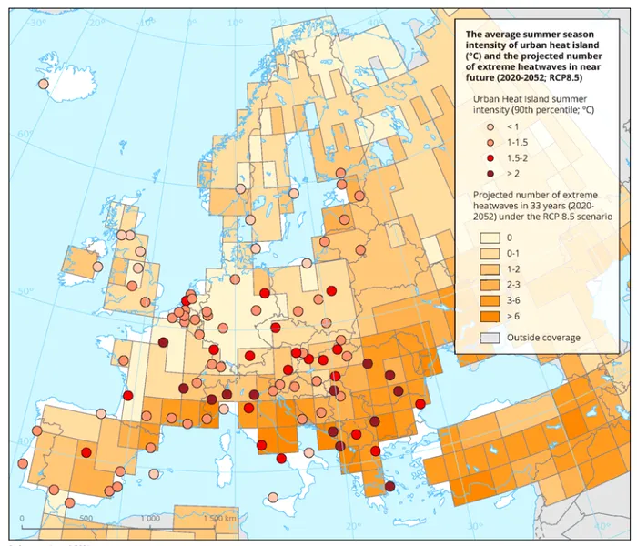 Intensitatea medie a sezonului estival al insulei de căldură urbană (°C) și numărul de valuri de căldură extreme în viitorul apropiat