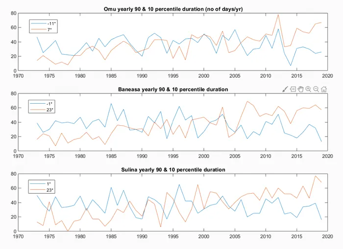 Începând cu a doua parte a decadei precedente, numărul de zile cu temperaturi minime a continuat să scadă în timp ce numărul de zile cu temperaturi mari a crescut. Evoluție similară putem observa și pentru stațiile meteo Băneasa și Sulina, notează Infoclima.