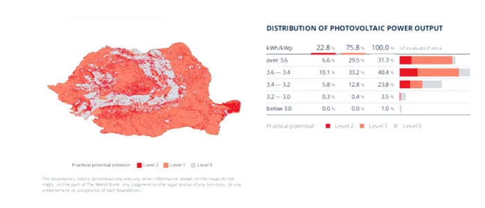 Țările situate în intervalul moderat favorabil de producție energetică, cuprins între 3,5 și 4,5 kWh/kWp, așa cum este cazul României, constituie 71% din totalul populației la nivel global.