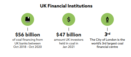 Ce este neclar, dat fiind faptul că bănci precum HSBC și Barclays au activitate financiară în țări UE precum Luxemburg, dacă investițiile acestora sunt luată de asemenea în considerare per ansamblu în perioada post- Brexit. Cert este că cele 5 bănci principale ale Marii Britanii (Barclays, HSBC, Standard Chartered, Lloyds si Natwest) au acordat împrumuturi și investit 314 miliarde $ USD de la adoptarea Tratatului climatic de la Paris în Decembrie 2015 (sursa pg. 26 City of Coal report).