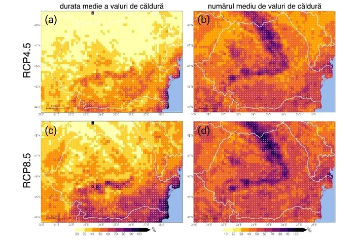 Astfel, frecvența de apariție și durata valurilor de căldură este proiectată să crească pentru ambele scenarii climatice, în special în sudul României. În această regiune, procentul de schimbare în viitorul apropiat pentru numărul de valuri de căldură este între 50 și 60% pentru scenariul RCP4.5 și 60-80% pentru scenariul RCP8.5.