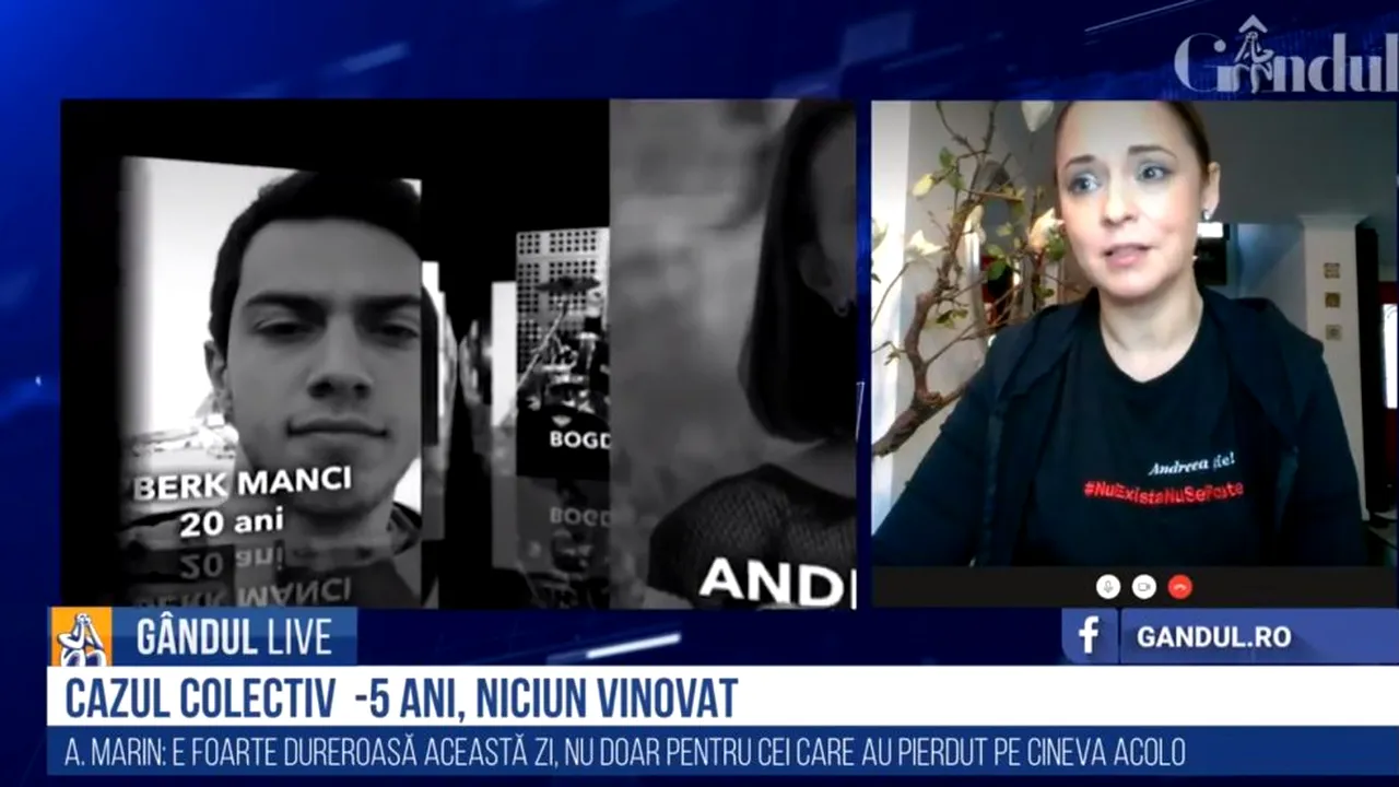 Andreea Marin vorbește în ediția de vineri, 30 octombrie, a emisiunii GÂNDUL LIVE, despre tragedia de la Clubul Colectiv, care s-a petrecut în urmă cu cinci ani, și despre cum a evoluat societatea, dar nu numai, după evenimentul care a marcat o generație și a produs drame dureroase în rândul supraviețuitorilor și a cunoștințelor celor care au decedat în acea noapte cumplită. De asemenea, aceasta a făcut câteva precizări și despre cum și cât s-a schimbat societatea după cumplita tragedie, făcând trimitere la ce se întâmplă în prezent, în contextul pandemiei de coronavirus.