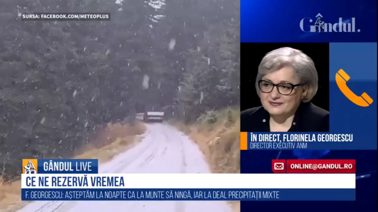 Directorul executiv al Administrației Naționale de Meteorologie (ANM), Florinela Georgescu, a vorbit vineri la GÂNDUL LIVE despre vremea din zilele următoare.